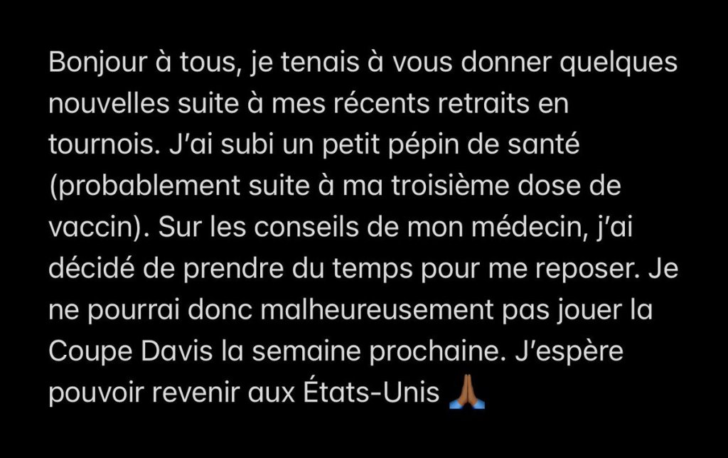 Et à l’inverse, on retrouve (toujours dans le domaine du tennis) Gael Montfils qui semble avoir des soucis liés à sa 3ème dose de vaccin (tweet ci-dessous) mais qui a indiqué ne pas regretter de s’être fait vacciné! Il s’est fait vacciné, c’est son choix mais il dit lui même que ces soucis de santé sont probablement dû au vaccin mais il ne se pose pas de questions sur ce qu’on lui a injecté??????