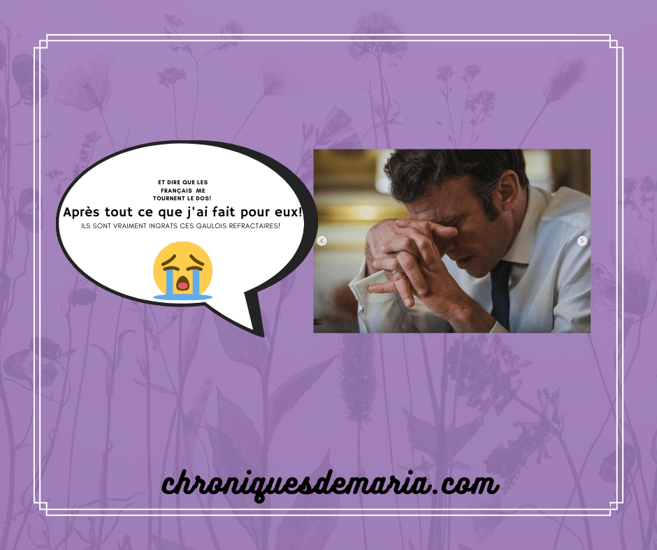 Le palais de l’Elysée vient de nous gratifier (on en a de la chance) de quelques photos de notre cher président au bout de sa vie après une conversation avec Vladimir Poutine à propos de l’Ukraine! Effectivement, on lit le désespoir sur ce qui fût jadis un beau visage (comme quoi il ne faut pas se fier aux apparences)… J’ai pris le parti d’imaginer ses pensées à propos des méchants français plutôt que du méchant Poutine!