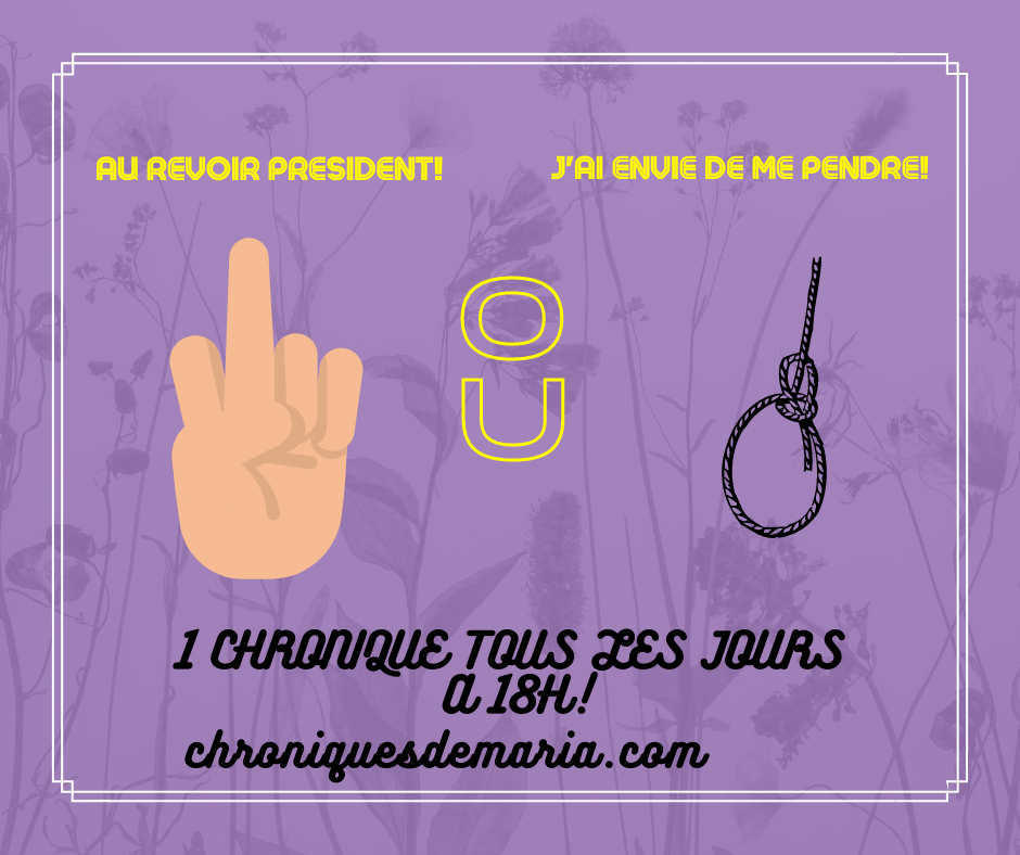 En ce dimanche 10 Avril, c’est le premier tour des présidentielles 2022 alors comme cette chronique sortira avant les résultats officiels, je vous propose 2 versions : la première « Au revoir président » si Minable 1er est dégagé dès le 1er tour ou si ce n’est pas le cas, une version remixée de mon poème « J’ai envie de me pendre ». Je ne vous cache pas que je prie pour la version 1.