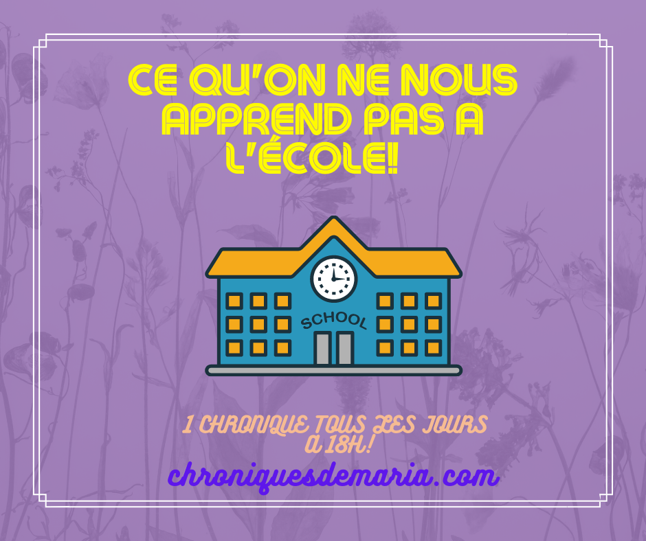 En France, l’école est obligatoire jusqu’à 16 ans du coup, on y est tous et toutes passé(e)s mais ce que je reproche à l’école, c’est qu’on apprend beaucoup de choses qui ne sont pas indispensables dans la vie et qu’à l’inverse, on ne nous apprend certaines choses dont on aurait pourtant besoin! En voilà quelques exemples :