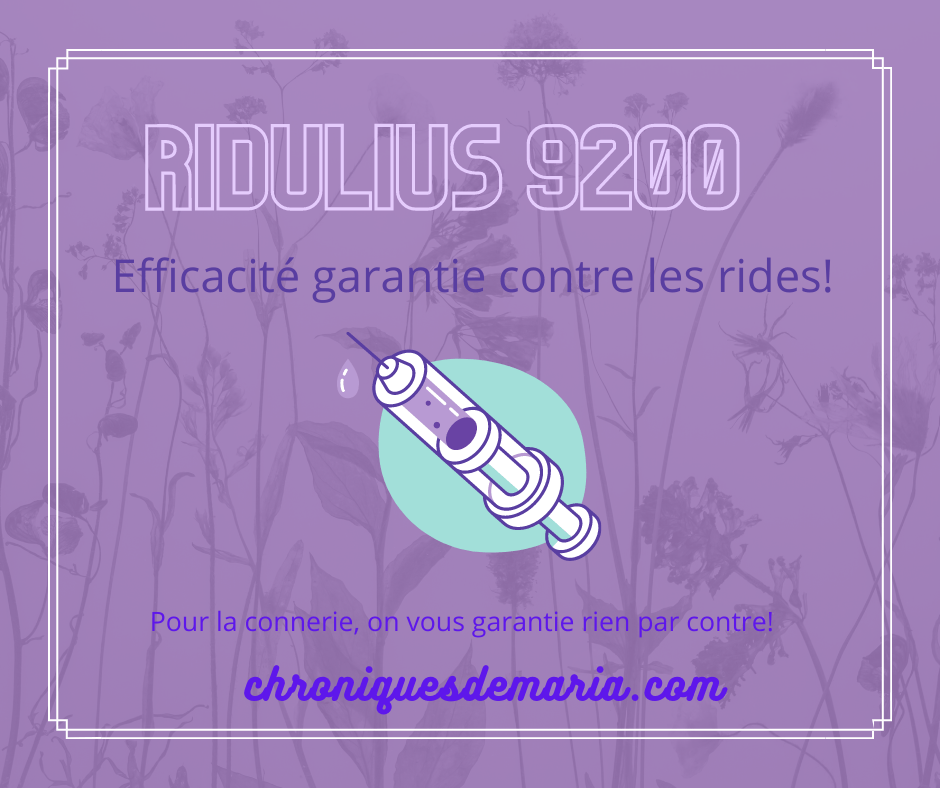 Vous avez des rides? Vous sentez vieille et moche? Pas de panique, j’ai la solution pour vous! Grâce au Ridulius 9200, faites disparaitre vos rides en 2,3 secondes et faites enfin partie du camp des winners (ben oui, les rides c’est démodées!). Et pour obtenir 10% de réduction, utilisez le code MARIAINFLUENCEAUTOP!