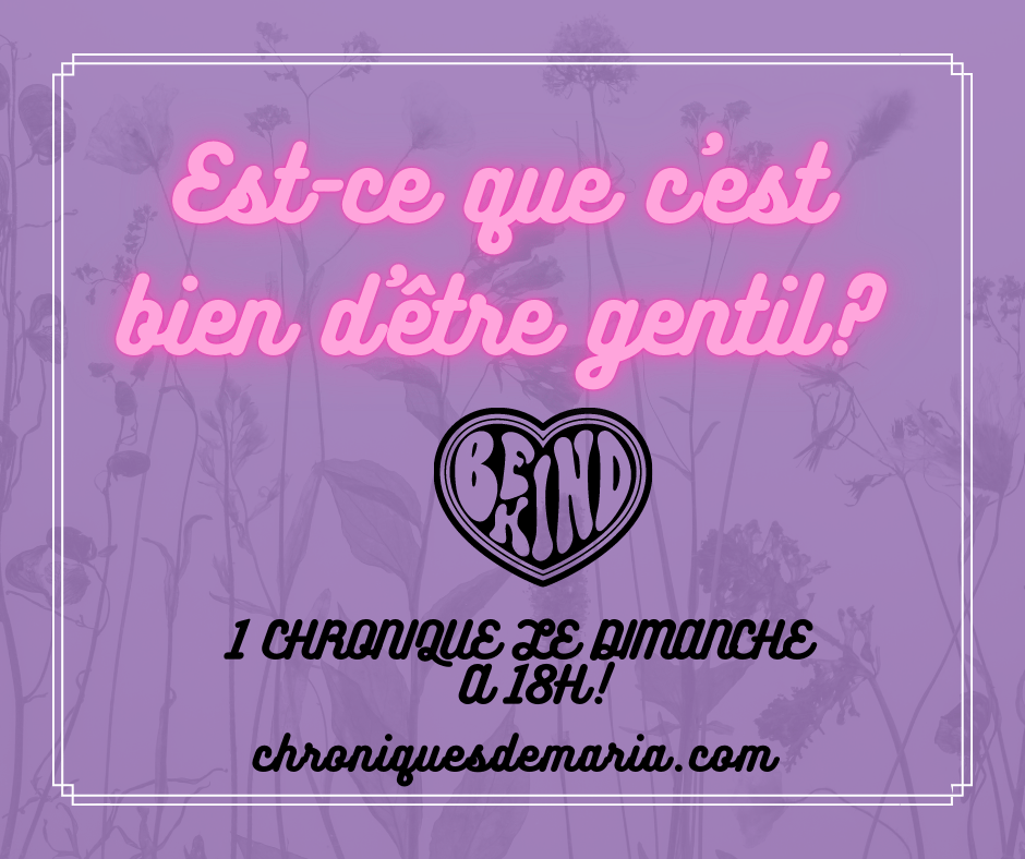 Je fais partie de la team Trop gentille et je vous assure que ça m’a déjà joué des tours! Pourtant, je ne compte pas cesser d’être gentille parce que c’est une de mes plus grandes qualités et ceux qui m’aiment en profitent. Par contre, il faut que j’apprenne à m’affirmer et à ne pas me laisser avoir par des gens mal intentionnés qui ne méritent pas ces attentions et qui ne me méritent pas tout court!