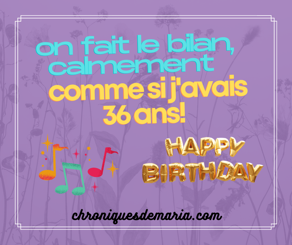 Aujourd’hui, j’ai 39 ans donc il ne me reste qu’un an avant la crise de la quarantaine! Ou pas! Rendez-vous l’année prochaine pour la savoir!